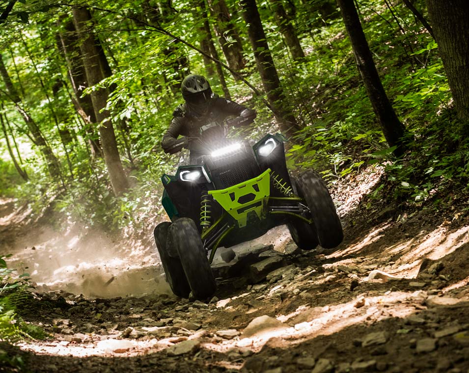 2 modes de conduite : Performance/Standard, Prise d'alimentation 12 volts, pré-câblée pour chauffe-mains et chauffe-pouces, port de chargement de batterie indépendant, Pare-chocs avant, plastiques peints, ressorts peints, élargisseurs d'ailes